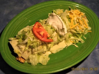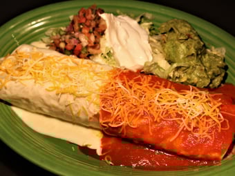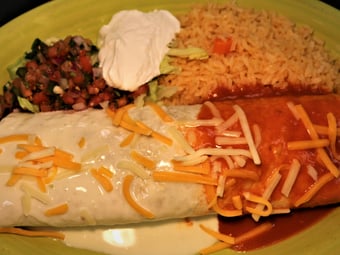 A large flour tortilla stuffed with seasoned ground beef or carnitas or shredded chicken, topped with red enchilada sauce, lettuce, tomato, sour cream, and cheese. Served with Mexican rice and pinto refried beans.