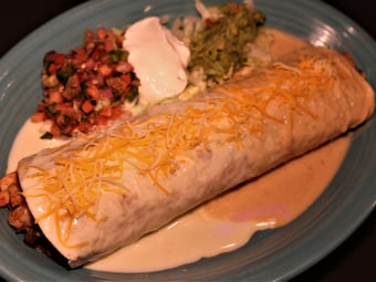 A large flour tortilla stuffed with your choice of grilled chicken or carnitas or grilled steak or al pastor pork or grilled shrimp and Mexican rice and refried beans inside, topped with queso dip, lettuce, sour cream, shredded cheese and tomato.