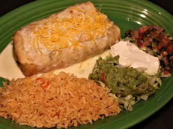 We stuff a large flour tortilla with refried pinto beans, rice, cheese, savory ground beef and seasoned shredded chicken breast, and then deep-fry it to a golden brown. Topped with queso dip and shredded cheese.