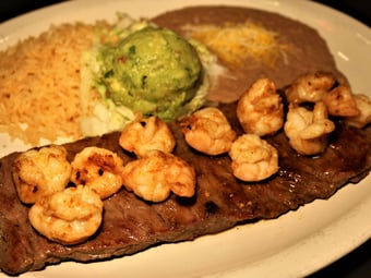 Tasty seasoned grilled chicken breast topped with grilled chorizo and queso dip. Served with Mexican rice, pinto refried beans, lettuce, pico de gallo and 4 warm corn or flour tortillas.