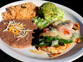 This house specialty features a tender marinated chicken breast, topped with grilled onions, green bell peppers and melted cheese. Served with Mexican rice, pinto refried beans, lettuce, pico de gallo