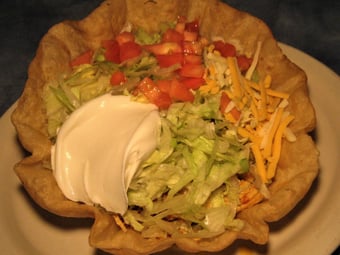 Crispy flour tortilla shell, filled with your choice of seasoned ground beef or seasoned shredded chicken breast or grilled chicken. Topped with queso dip, lettuce, cheese, tomato, guacamole and sour cream.