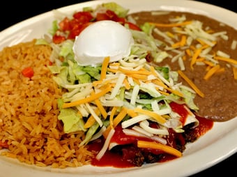 Two flour or corn tortillas stuffed with cheese, beef or shredded chicken topped with ranchero sauce and shredded cheese. Served with Mexican rice, black or pinto refried beans or charro beans, lettuce, pico de gallo and sour cream.