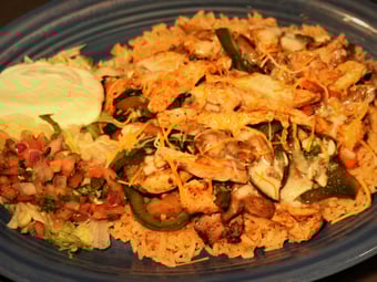 Seasoned grilled chicken breast with fresh grilled zucchini, carrots, yellow squash, mushrooms and green bell peppers. Served on a bed of Mexican rice and topped with queso dip and cheese.