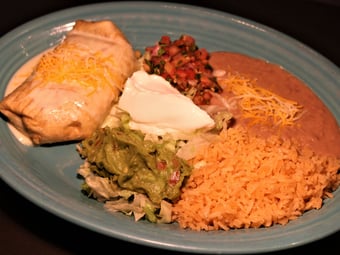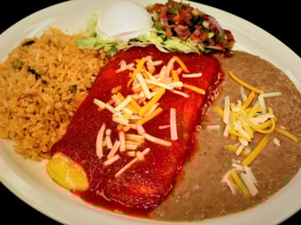 A large flour tortilla stuffed with seasoned ground beef or carnitas or shredded chicken or grilled chicken, topped with red enchilada sauce, lettuce, tomato, sour cream, and cheese. Served with Mexican rice and black or pinto refried beans or charro beans.