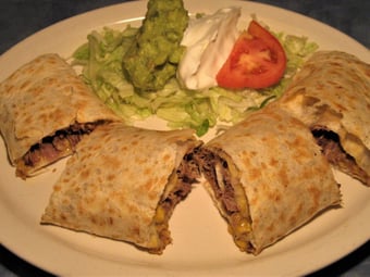 Large flour tortilla filled with grilled cheese, sautéed onions, tomatoes, green bell peppers and your choice of Steak or Chicken or Shrimp