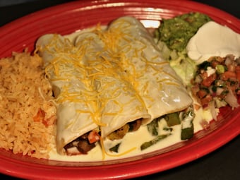 Two flour or corn tortillas stuffed with fresh grilled zucchini, carrots, yellow squash, mushrooms and green bell peppers. Glazed with queso dip and cheese and served with Mexican rice, lettuce, guacamole, pico de gallo and sour cream.