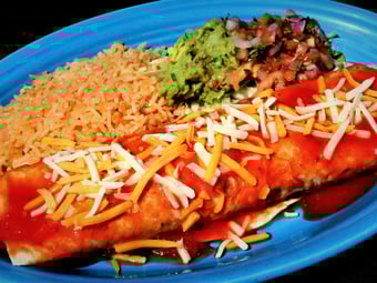 Large flour tortilla stuffed with fresh grilled zucchini, carrots, yellow squash, mushrooms, green bell peppers, cheese and refried beans. Glazed with queso dip and cheese and served with Mexican rice, lettuce, guacamole and pico de gallo.